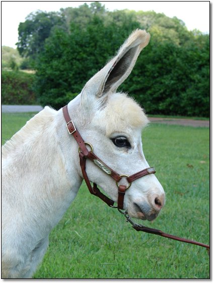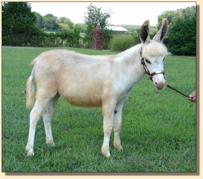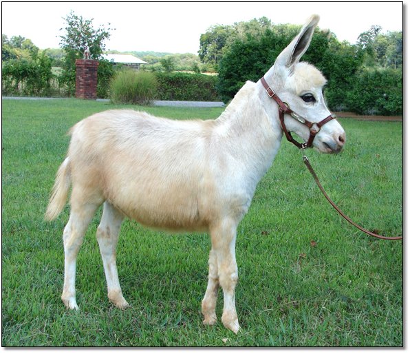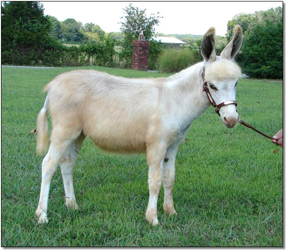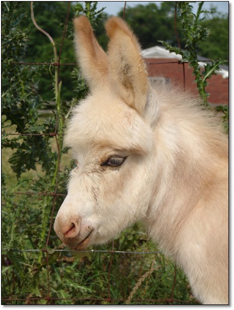 The delicate color of champagne and the sweetness of homemade jam all wrapped up in this precious sorrel spotted jennet. She is simply beautiful displaying her blanket of soft pink as she makes herself so available to us as we enter her paddock. She runs to greet us every time she see us and rubs against us showing how much she enjoys being with people. We have to be very careful when we leave her paddock as she would walk right on out with us. Jammy is truly a people/lap donkey.