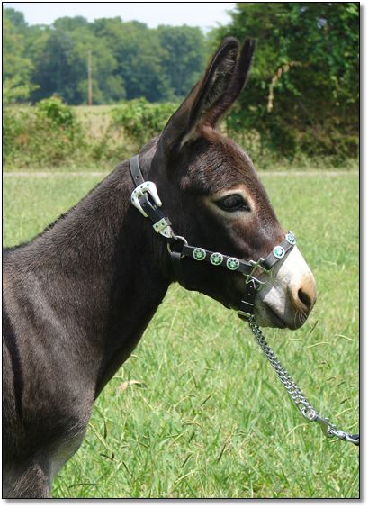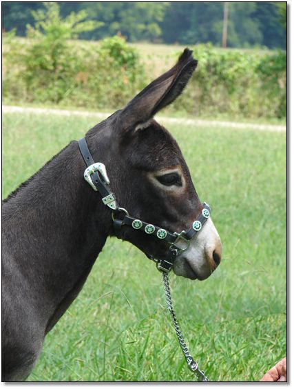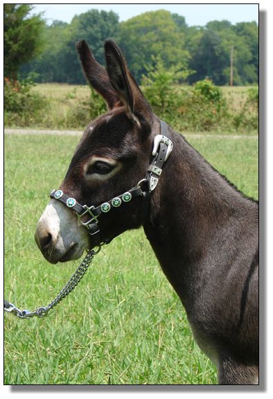 We purchased Tina after The Great American Miniature Donkey Sale on July 26th, 2008. She is very well balanced for such a small jennet. Tina should have been named Buttons and Bows as she has two identicla bows on each of her sides right in front of her hips. She is such a tiny thing that we will wait until she is almost four years old to bred her for the first time.